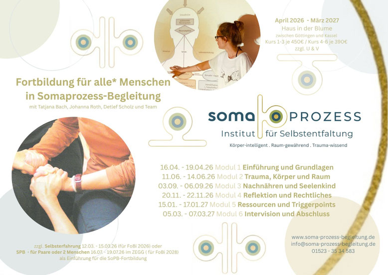 Einführung in die Grundbegriffe der Somaprozess-Begleitung, Haltungen und Techniken der Somaprozess-Begleitung, Basiswissen über psychologisches Trauma und Techniken der Stabilisierung, Arbeit